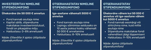 - Alates ühekordsest 50000-eurosest annetusest on võimalik asutada investeeritav nimeline stipendiumifond, mille vahendeid haldab edaspidi sihtasutus ning stipendiume makstakse fondi investeerimisest saadud kasumi arvelt. Sellisel juhul kannab fond asutaja nime ja fondi eesmärki või sihtrühma (näiteks „Ettevõtte X ajaloo üliõpilaste stipendiumifond“). See on hea võimalus anda annetusele pikaajaline mõju, kuna fondi tehtud sissemakse säilub. Sihtasutus võtab üle 50000-euroselt annetuselt ühekordselt 8% haldustasu, mis katab tähtajatult kogu stipendiumifondi toimimiseks vajaliku kulu, sh fondi statuudi ja asutamislepingu koostamise, fondi vahendite investeerimise, stipendiumikonkursside haldamise ja (järel)kommunikatsiooniga seotud kulud.
