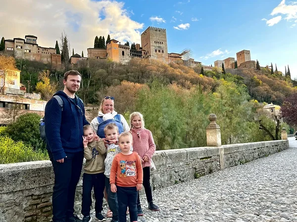Perekond Kalam Granadas Alhambra kindluse ees: Kristjan (36), Britt (36), Maria (9), Markus (7), Mattias (6), Marten (4) ja Marta (1). Foto: erakogu
